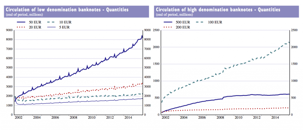 Tras la introducción del efectivo en euros en 2002, el valor y el número de billetes se ha incrementado de forma constante. En octubre de 2008 tuvimos un incremento tras el colapso de Lehman Brothers y el empeoramiento de la crisis financiera. Muchas personas retiraron dinero de sus cuentas de ahorro. Por ello el valor de los billetes en euros que estaban en circulación en octubre de 2008 registró un importante aumento incrementándose en unos 35-40 miles de millones de euros.